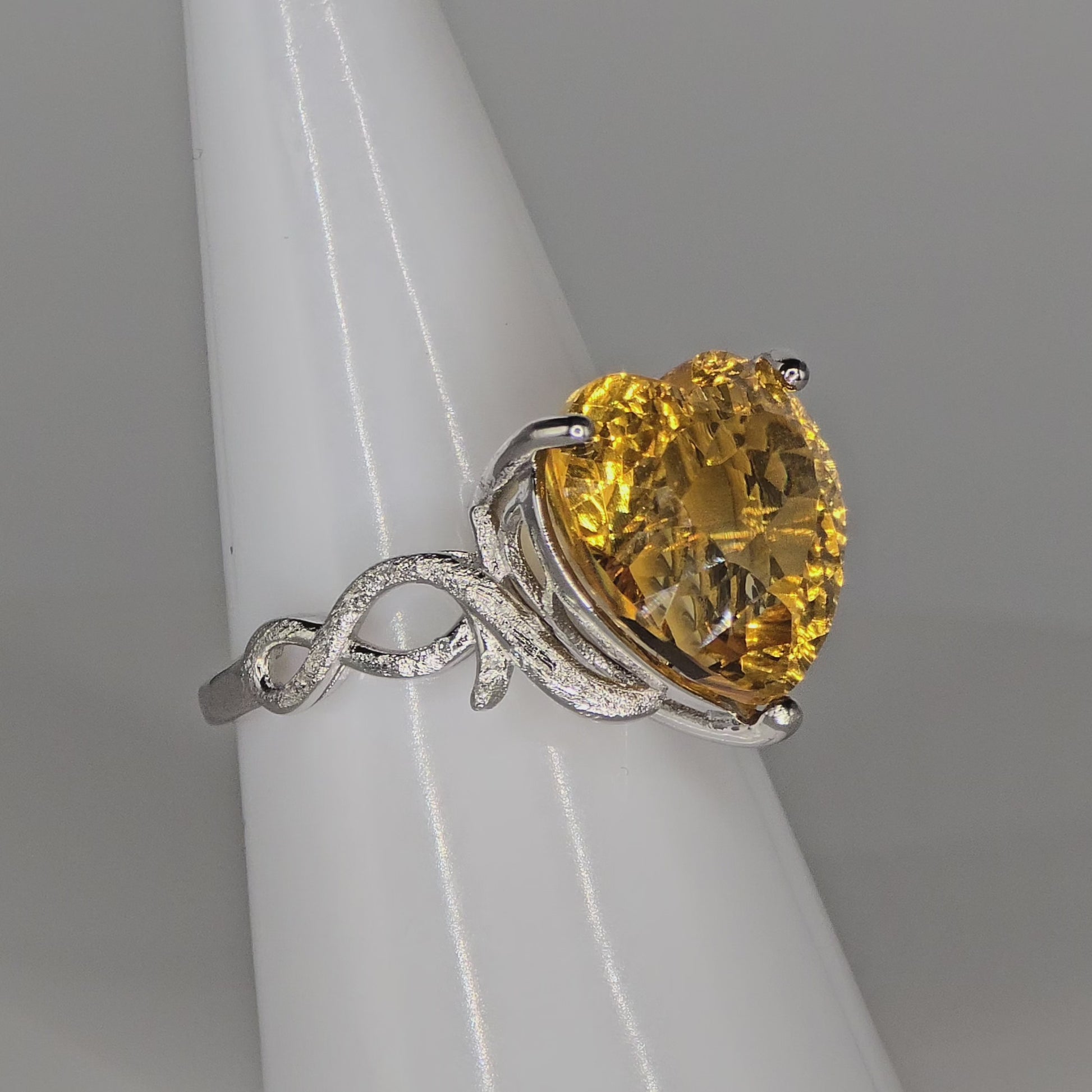 Set hearts ablaze with the radiant glow of the Golden Flame Ring—a heart-shaped Brazil Citrine ablaze with warmth and energy. Framed in silver with delicate curling detail along the band, this adjustable ring feels like wearing a spark of sun-kissed passion on your hand.