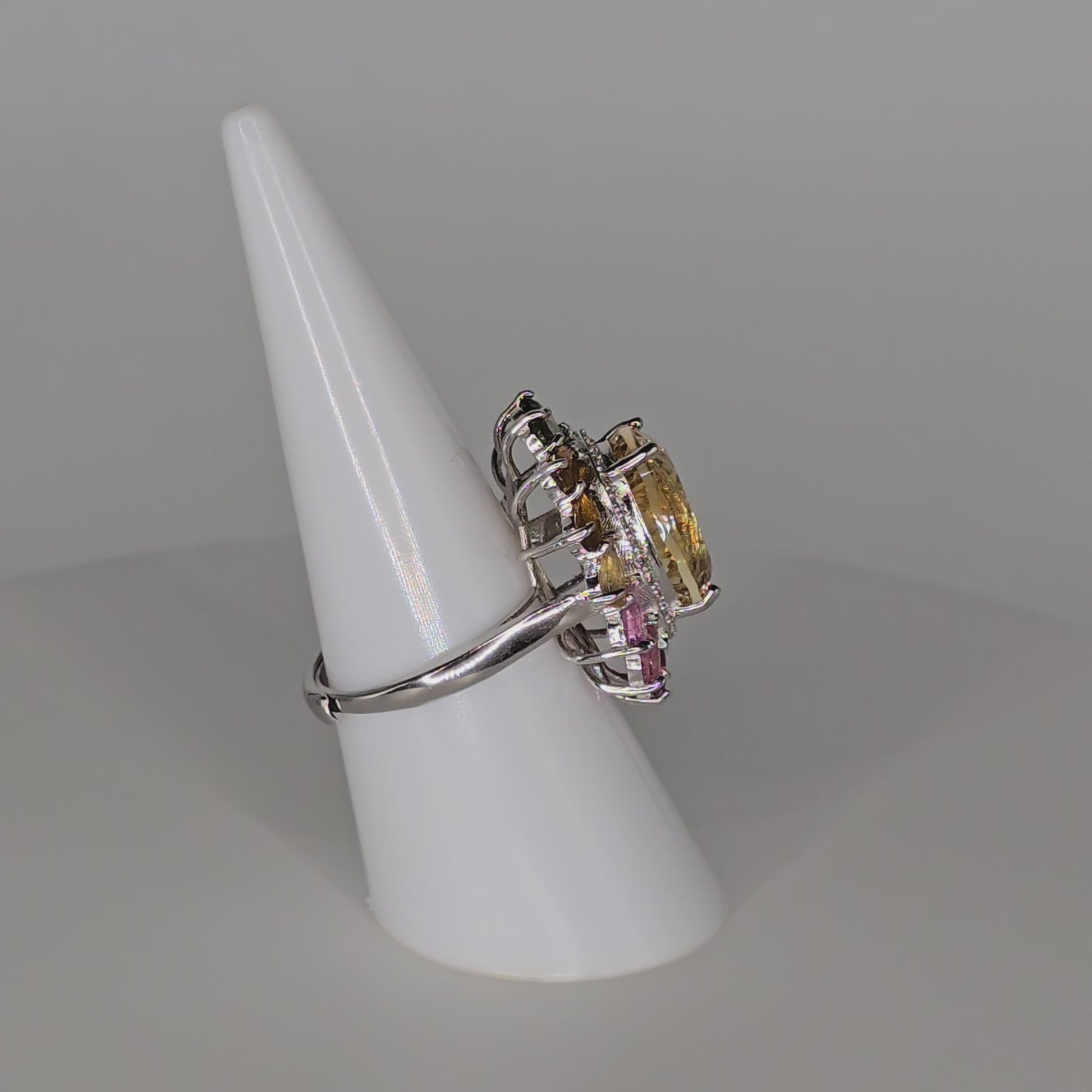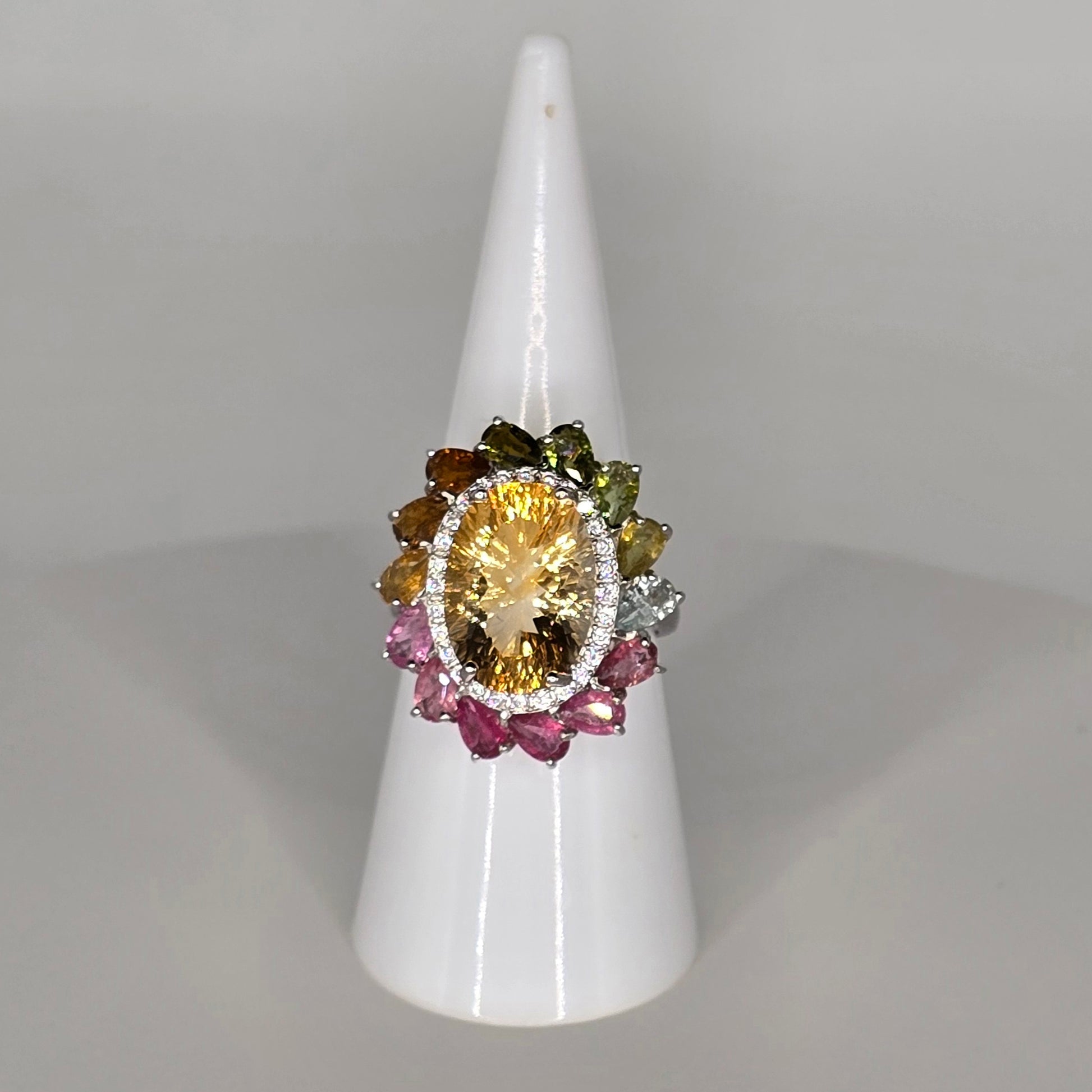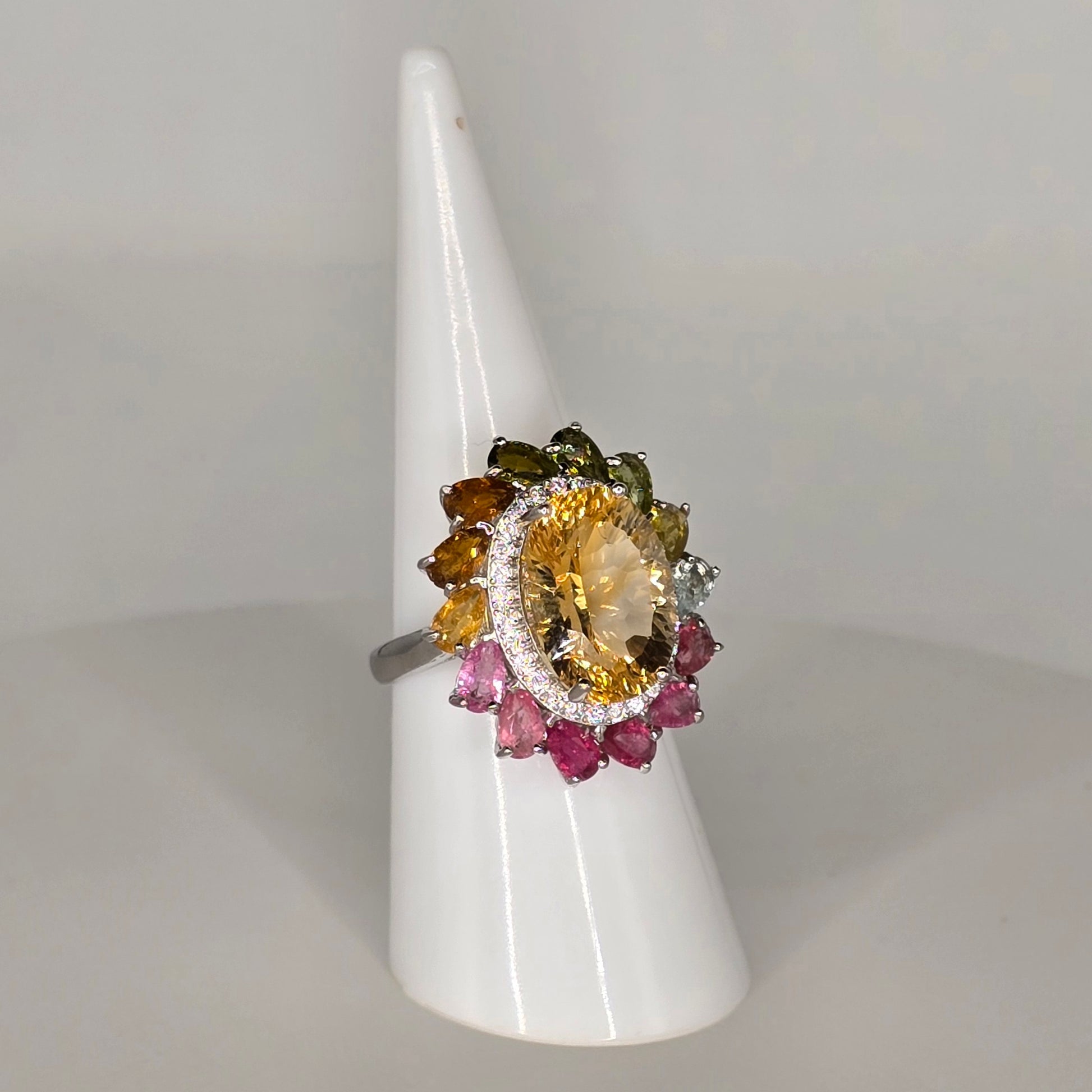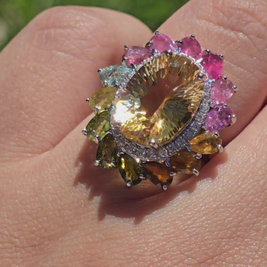 Meet Sunflower—a luminous celebration of light, warmth, and feminine power. Featuring a radiant citrine center surrounded by a bouquet of multicolored tourmaline stones, this adjustable 925 silver ring brings the full spectrum of joy to your fingers. A halo of CZ stones adds an extra touch of sparkle, like sunlight dancing on petals.